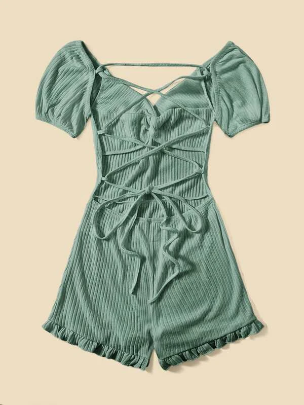 Lace Up Backless Ruffle Hem Romper