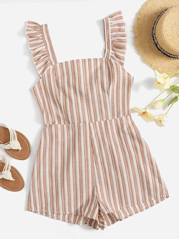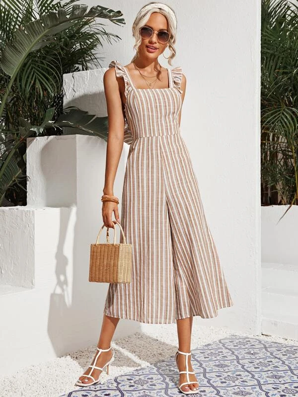 Ruffle Armhole Tie Back Striped Jumpsuit