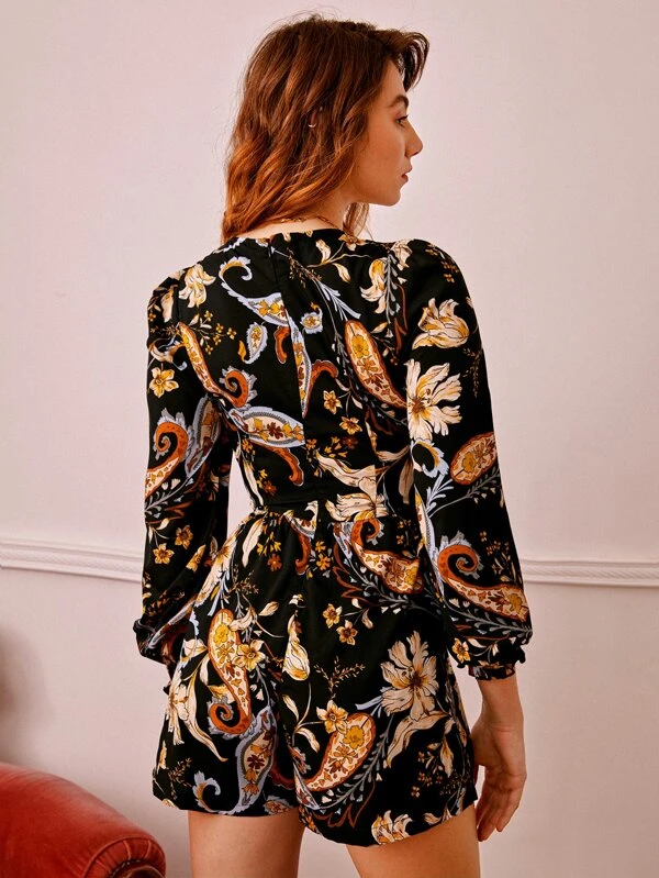Floral Print Shirred Cuff Ruched Waist Romper