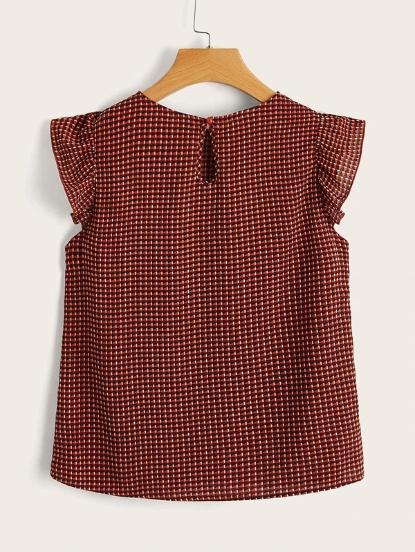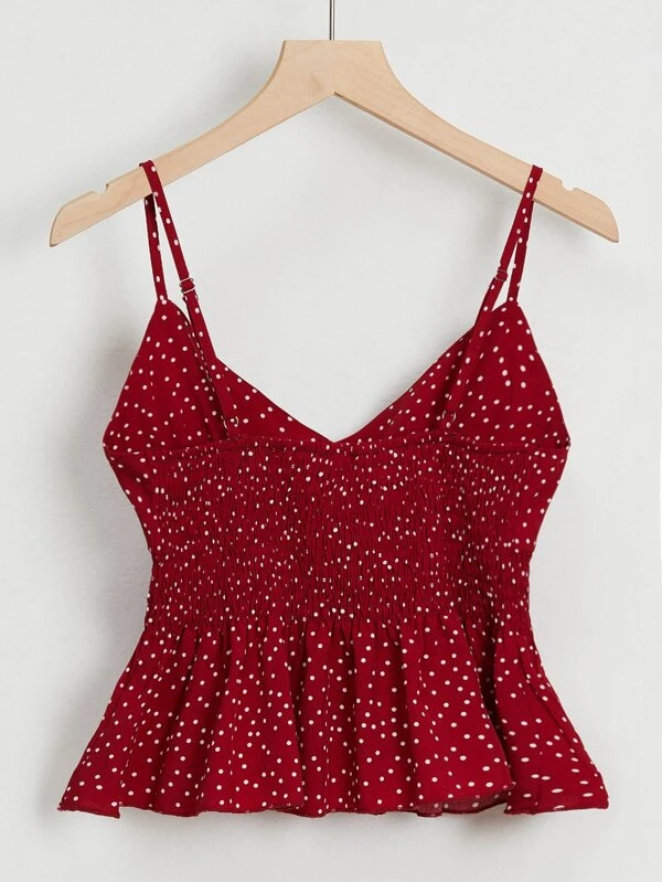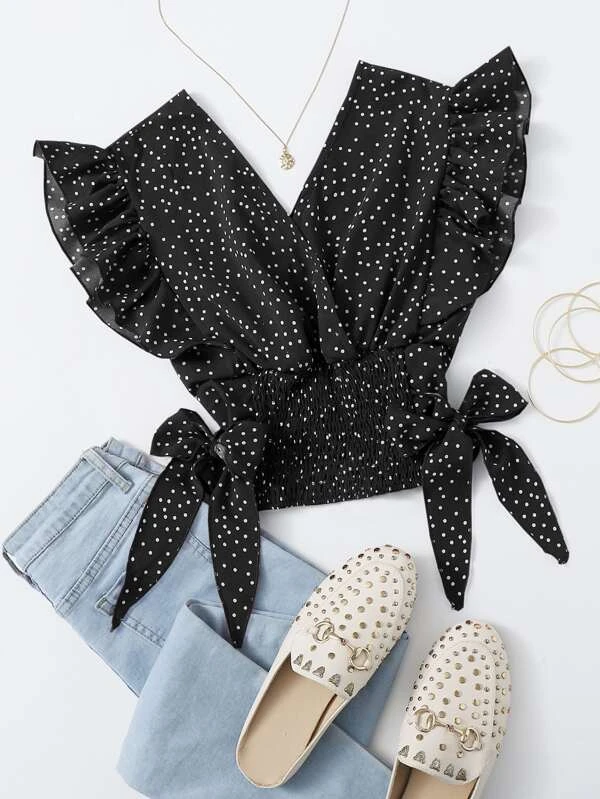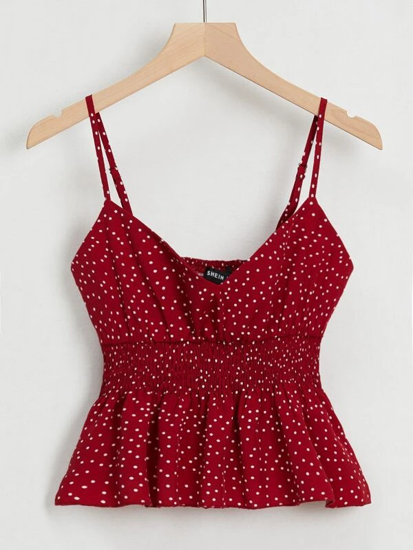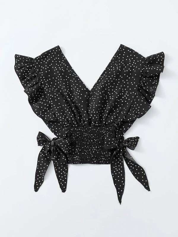 Armhole Shirred Hem Polka-dot Top