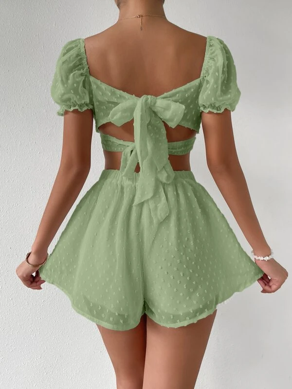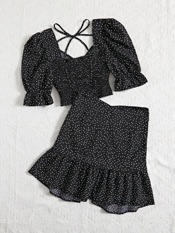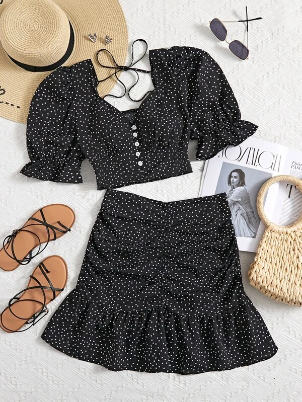 Polka Dot Puff Sleeve & Ruffle Hem Skirt
